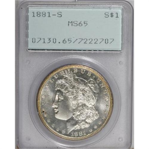 <B>1881-S $1 MS65 PCGS.</B></I> PCGS Population (40998/11559). NGC Census: (39444/14469). Mintage: 12,760,000. Numismedia Wsl. Price for NGC/PCGS coin in MS65: $117. (#7130)<BR><BR><B>Coin Engraver:</B> George T. Morgan<BR><BR><b>Shipping:</b> Coins & Currency (<a target="_blank" href="http://www.heritageauctions.com/common/shipping.php">view shipping information</a>)