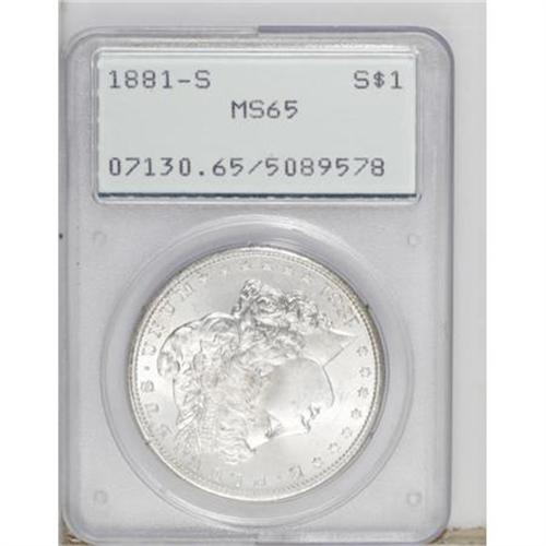 <B>1881-S $1 MS65 PCGS.</B></I> PCGS Population (41103/11632). NGC Census: (39951/14692). Mintage: 12,760,000. Numismedia Wsl. Price for NGC/PCGS coin in MS65: $118. (#7130)<BR><BR><B>Coin Engraver:</B> George T. Morgan<BR><BR><b>Shipping:</b> Coins & Currency (<a target="_blank" href="http://www.heritageauctions.com/common/shipping.php">view shipping information</a>)