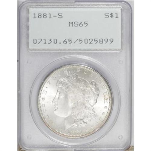 <B>1881-S $1 MS65 PCGS.</B></I> PCGS Population (41103/11632). NGC Census: (39951/14692). Mintage: 12,760,000. Numismedia Wsl. Price for NGC/PCGS coin in MS65: $118. (#7130)<BR><BR><B>Coin Engraver:</B> George T. Morgan<BR><BR><b>Shipping:</b> Coins & Currency (<a target="_blank" href="http://www.heritageauctions.com/common/shipping.php">view shipping information</a>)
