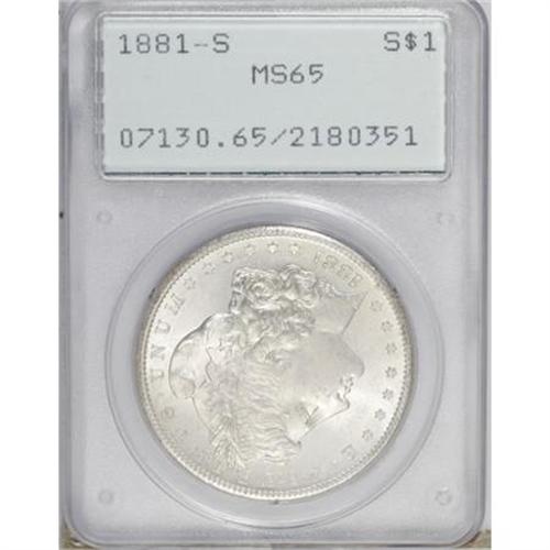 <B>1881-S $1 MS65 PCGS.</B></I> PCGS Population (41087/11626). NGC Census: (39951/14692). Mintage: 12,760,000. Numismedia Wsl. Price for NGC/PCGS coin in MS65: $117. (#7130)<BR><BR><B>Coin Engraver:</B> George T. Morgan<BR><BR><b>Shipping:</b> Coins & Currency (<a target="_blank" href="http://www.heritageauctions.com/common/shipping.php">view shipping information</a>)