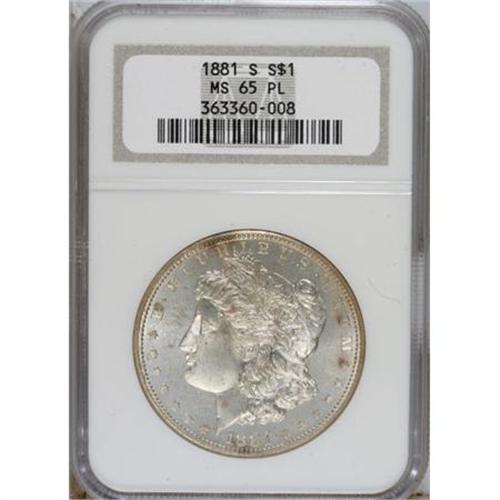 <B>1881-S $1 MS65 Prooflike NGC.</B></I> NGC Census: (1488/590). PCGS Population (1793/539). Numismedia Wsl. Price for NGC/PCGS coin in MS65: $200. (#7131)<BR><BR><b>Shipping:</b> Coins & Currency (<a target="_blank" href="http://www.heritageauctions.com/common/shipping.php">view shipping information</a>)