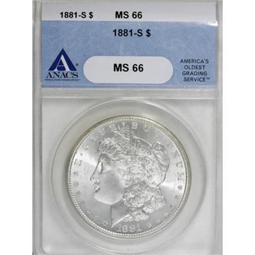 <B>1881-S $1 MS66 ANACS.</B></I> NGC Census: (11721/2748). PCGS Population (10219/1363). Mintage: 12,760,000. Numismedia Wsl. Price for NGC/PCGS coin in MS66: $240. (#7130)<BR><BR><B>Coin Engraver:</B> George T. Morgan<BR><BR><b>Shipping:</b> Coins & Currency (<a target="_blank" href="http://www.heritageauctions.com/common/shipping.php">view shipping information</a>)