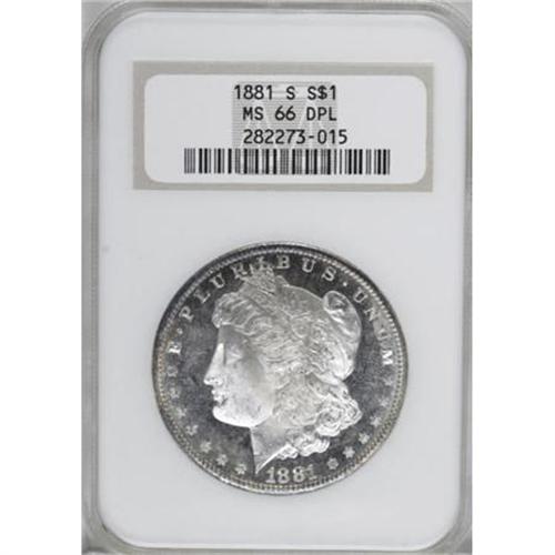 <B>1881-S $1 MS66 Deep Mirror Prooflike NGC.</B></I> Golden-brown and plum-red enrich the margins. The cameo frost is especially impressive on the obverse. Well struck, attractive, and encapsulated in a prior generation holder.<BR><I>Ex: Kansas City Bullet (Heritage, 4/96), lot 327.</B></I><BR><BR><b>Shipping:</b> Coins & Currency (<a target="_blank" href="http://www.heritageauctions.com/common/shipping.php">view shipping information</a>)