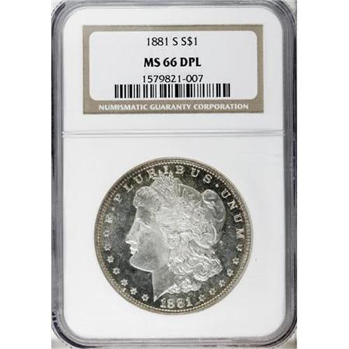 <B>1881-S $1 MS66 Deep Mirror Prooflike NGC.</B></I> Well preserved and fully struck, from one of the best-produced issues in the series. Great prooflikeness in the fields and lovely golden-coral peripheral toning ensure the visual allure of this Premium Gem. The '81-S is much less common with Deep Mirror Prooflike surfaces, compared to the ubiquitous non-prooflike pieces. <BR><BR><b>Shipping:</b> Coins & Currency (<a target="_blank" href="http://www.heritageauctions.com/common/shipping.php">view shipping information</a>)