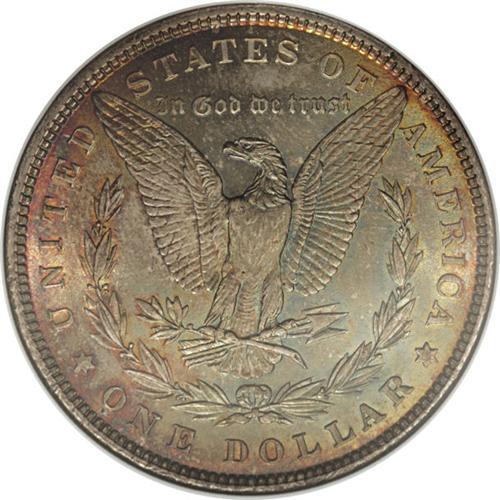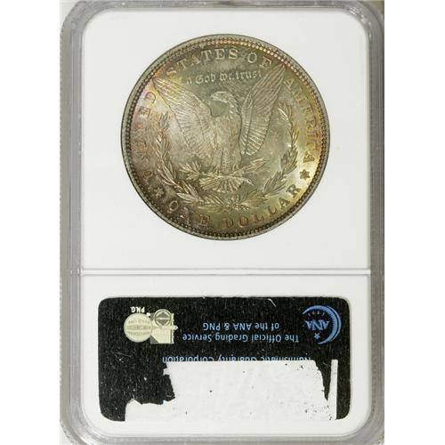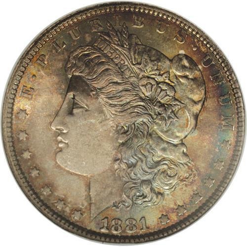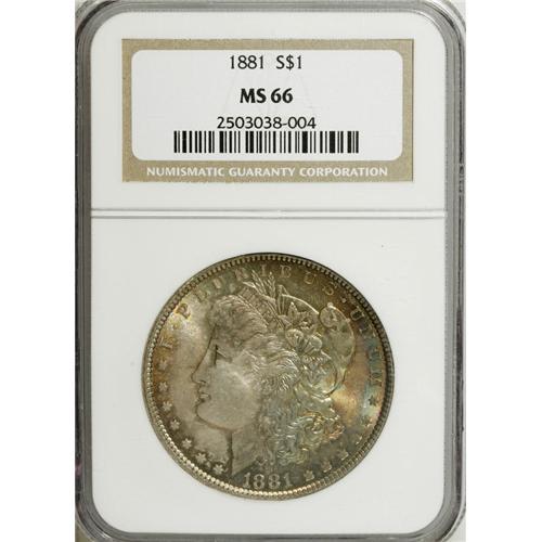 <B>1881 S$1 MS66 NGC.</B></I> David Bowers (2005) writes of the 1881 dollar, with a generous mintage of 9,163,000 business strikes, that: "Sharply struck, lustrous coins with superb eye appeal are hard to find and mount a challenge for the serious collector." The current Premium Gem, therefore, provides Morgan dollar enthusiasts with an infrequent opportunity. Dazzling luster radiates from well preserved surfaces that are bathed in a mix of aqua-green, purple, golden-brown, and orange toning, and a well executed strike results in sharply defined motifs. A couple of light inoffensive marks in the right reverse field do not detract. Census: 48 in 66, 4 finer (3/07).<BR><BR><b>Shipping:</b> Coins & Currency (<a target="_blank" href="http://www.heritageauctions.com/common/shipping.php">view shipping information</a>)