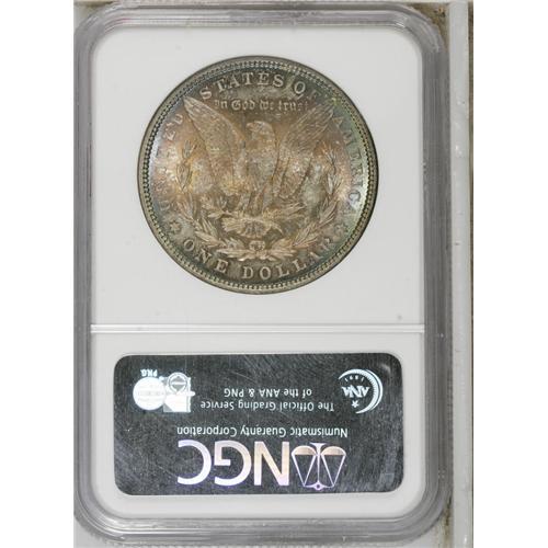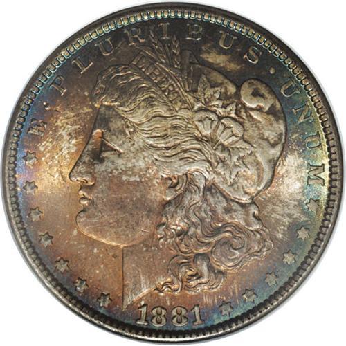 1881 S$1 MS66 NGC. Deep crescents of cobalt-blue, ambe