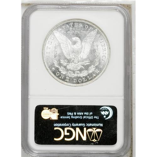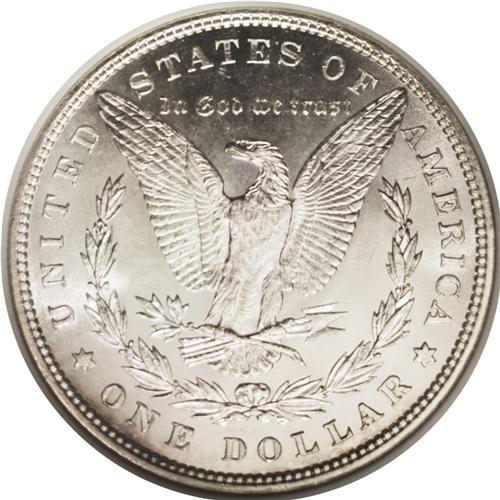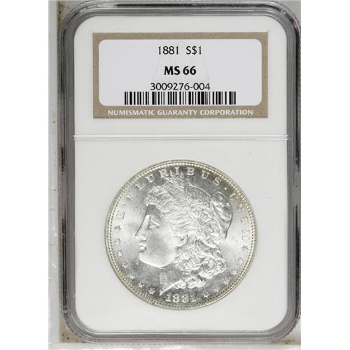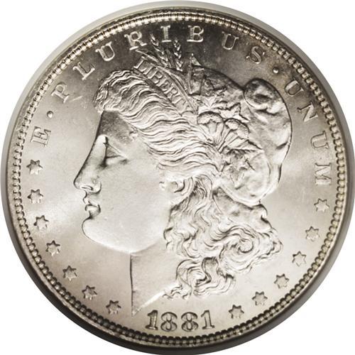 <B>1881<img border='0' src='http://www.heritagecoins.com/images/star.gif' width=10 height=10>$1> MS66 NGC.</B></I> The large mintage in excess of 9 million coins ensures the survival of high-end examples such as the present specimen. The luster is superior, emanating from surfaces that are untoned, save for a glint of gold on the rims of each side. The strike is fairly well executed, with about half of the hair over the ear bold, a robustness on the eagle's breast. An appealing and nearly unsurpassable coin. Census: 42 in 66, 3 finer (8/06).