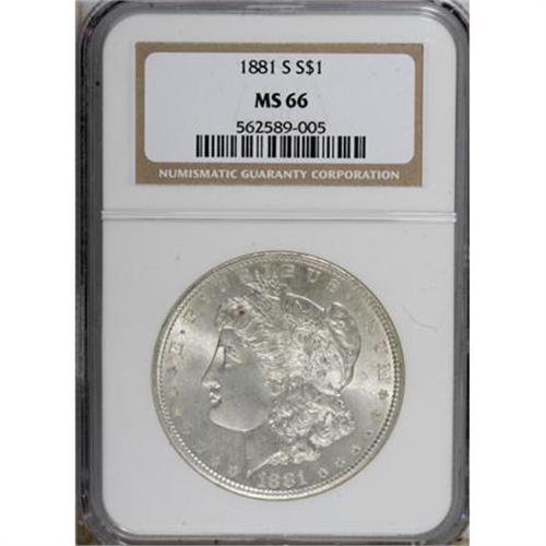 <B>1881-S $1 MS66 NGC.</B></I> NGC Census: (11614/2687). PCGS Population (10100/1323). Mintage: 12,760,000. Numismedia Wsl. Price for NGC/PCGS coin in MS66: $248. (#7130)<BR><BR><B>Coin Engraver:</B> George T. Morgan<BR><BR><b>Shipping:</b> Coins & Currency (<a target="_blank" href="http://www.heritageauctions.com/common/shipping.php">view shipping information</a>\)