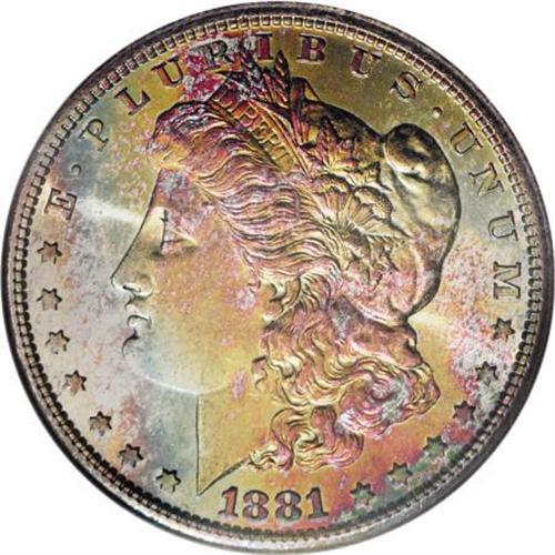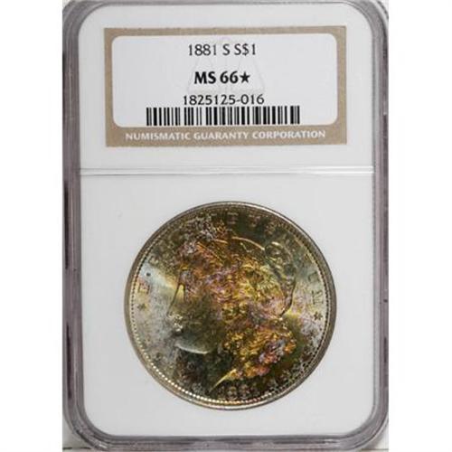 <B>1881-S $1 MS66 <img border='0' src='http://www.heritagecoins.com/images/star.gif' width=10 height=10> NGC.</B></I> Medium intensity multicolored toning covers the obverse, while the reverse is essentially brilliant. A light mark on Liberty's cheek is mentioned for accuracy. The eye appeal of this colorful Premium Gem is simply extraordinary, as confirmed by the coveted "Star" designation from NGC. <BR><BR><B>Coin Engraver:</B> George T. Morgan<BR><BR><b>Shipping:</b> Coins & Currency (<a target="_blank" href="http://www.heritageauctions.com/common/shipping.php">view shipping information</a>)