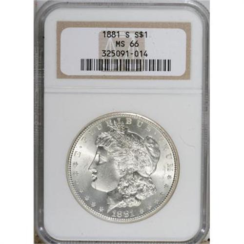 <B>1881-S $1 MS66 NGC.</B></I> NGC Census: (11690/2741). PCGS Population (10169/1330). Mintage: 12,760,000. Numismedia Wsl. Price for NGC/PCGS coin in MS66: $248. (#7130)<BR><BR><B>Coin Engraver:</B> George T. Morgan<BR><BR><b>Shipping:</b> Coins & Currency (<a target="_blank" href="http://www.heritageauctions.com/common/shipping.php">view shipping information</a>)