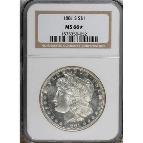<B>1881-S $1 MS66</B></I> S<B> NGC.</B></I> NGC Census: (11690/2741). PCGS Population (10169/1330). Mintage: 12,760,000. Numismedia Wsl. Price for NGC/PCGS coin in MS66: $248. (#7130)<BR><BR><B>Coin Engraver:</B> George T. Morgan<BR><BR><b>Shipping:</b> Coins & Currency (<a target="_blank" href="http://www.heritageauctions.com/common/shipping.php">view shipping information</a>)