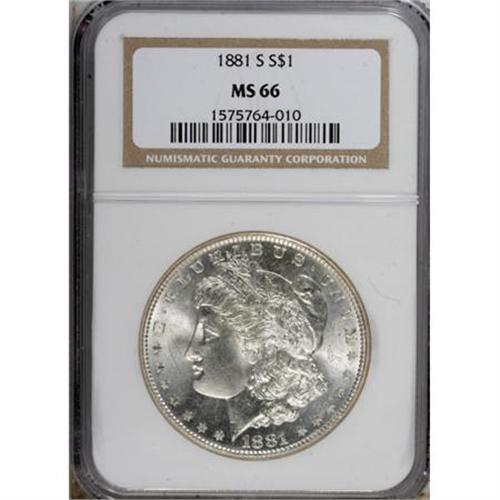 <B>1881-S $1 MS66 NGC.</B></I> NGC Census: (11690/2741). PCGS Population (10171/1330). Mintage: 12,760,000. Numismedia Wsl. Price for NGC/PCGS coin in MS66: $248. (#7130)<BR><BR><B>Coin Engraver:</B> George T. Morgan<BR><BR><b>Shipping:</b> Coins & Currency (<a target="_blank" href="http://www.heritageauctions.com/common/shipping.php">view shipping information</a>)