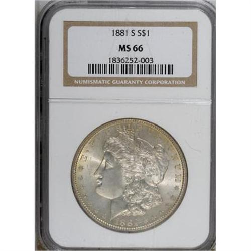 <B>1881-S $1 MS66 NGC.</B></I> NGC Census: (11721/2748). PCGS Population (10207/1333). Mintage: 12,760,000. Numismedia Wsl. Price for NGC/PCGS coin in MS66: $240. (#7130)<BR><BR><B>Coin Engraver:</B> George T. Morgan<BR><BR><b>Shipping:</b> Coins & Currency (<a target="_blank" href="http://www.heritageauctions.com/common/shipping.php">view shipping information</a>)