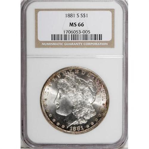 <B>1881-S $1 MS66 NGC.</B></I> NGC Census: (11690/2741). PCGS Population (10197/1333). Mintage: 12,760,000. Numismedia Wsl. Price for NGC/PCGS coin in MS66: $248. (#7130)<BR><BR><B>Coin Engraver:</B> George T. Morgan<BR><BR><b>Shipping:</b> Coins & Currency (<a target="_blank" href="http://www.heritageauctions.com/common/shipping.php">view shipping information</a>)
