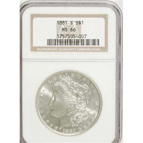 <B>1881-S $1 MS66 NGC.</B></I> NGC Census: (11721/2748). PCGS Population (10205/1356). Mintage: 12,760,000. Numismedia Wsl. Price for NGC/PCGS coin in MS66: $240. (#7130)<BR><BR><B>Coin Engraver:</B> George T. Morgan<BR><BR><b>Shipping:</b> Coins & Currency (<a target="_blank" href="http://www.heritageauctions.com/common/shipping.php">view shipping information</a>)