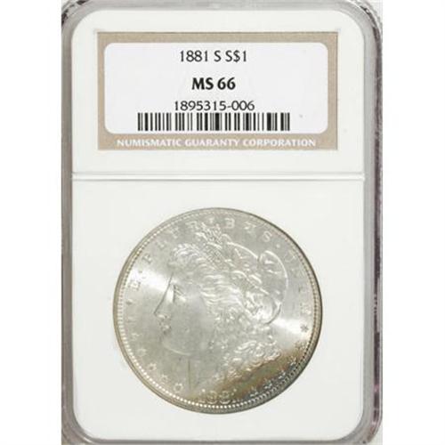 <B>1881-S $1 MS66 NGC.</B></I> NGC Census: (11881/2787). PCGS Population (10253/1369). Mintage: 12,760,000. Numismedia Wsl. Price for NGC/PCGS coin in MS66: $240. (#7130)<BR><BR><B>Coin Engraver:</B> George T. Morgan<BR><BR><b>Shipping:</b> Coins & Currency (<a target="_blank" href="http://www.heritageauctions.com/common/shipping.php">view shipping information</a>)