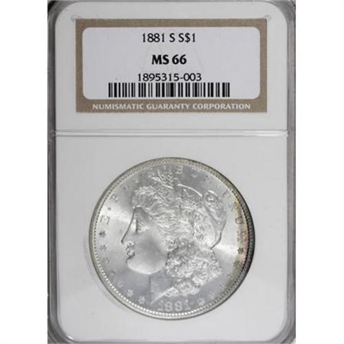 <B>1881-S $1 MS66 NGC.</B></I> NGC Census: (11881/2787). PCGS Population (10253/1369). Mintage: 12,760,000. Numismedia Wsl. Price for NGC/PCGS coin in MS66: $240. (#7130)<BR><BR><B>Coin Engraver:</B> George T. Morgan<BR><BR><b>Shipping:</b> Coins & Currency (<a target="_blank" href="http://www.heritageauctions.com/common/shipping.php">view shipping information</a>)