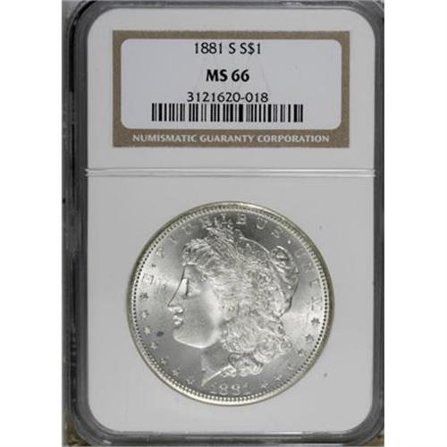 <B>1881-S $1 MS66 NGC.</B></I> . NGC Census: (11985/2855). PCGS Population (10307/1381). Mintage: 12,760,000. Numismedia Wsl. Price for NGC/PCGS coin in MS66: $240. (#7130)<BR><BR><B>Coin Engraver:</B> George T. Morgan<BR><BR><b>Shipping:</b> Coins & Currency (<a target="_blank" href="http://www.heritageauctions.com/common/shipping.php">view shipping information</a>)