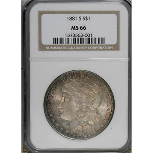 <B>1881-S $1 MS66 NGC.</B></I> . NGC Census: (11985/2855). PCGS Population (10307/1381). Mintage: 12,760,000. Numismedia Wsl. Price for NGC/PCGS coin in MS66: $240. (#7130)<BR><BR><B>Coin Engraver:</B> George T. Morgan<BR><BR><b>Shipping:</b> Coins & Currency (<a target="_blank" href="http://www.heritageauctions.com/common/shipping.php">view shipping information</a>)