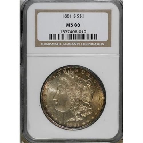 <B>1881-S $1 MS66 NGC.</B></I> NGC Census: (12020/2868). PCGS Population (10334/1390). Mintage: 12,760,000. Numismedia Wsl. Price for NGC/PCGS coin in MS66: $240. (#7130)<BR><BR><B>Coin Engraver:</B> George T. Morgan<BR><BR><b>Shipping:</b> Coins & Currency (<a target="_blank" href="http://www.heritageauctions.com/common/shipping.php">view shipping information</a>)