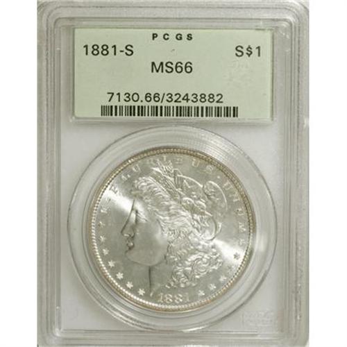 <B>1881-S $1 MS66 PCGS.</B></I> PCGS Population (10100/1323). NGC Census: (11614/2687). Mintage: 12,760,000. Numismedia Wsl. Price for NGC/PCGS coin in MS66: $248. (#7130)<BR><BR><B>Coin Engraver:</B> George T. Morgan<BR><BR><b>Shipping:</b> Coins & Currency (<a target="_blank" href="http://www.heritageauctions.com/common/shipping.php">view shipping information</a>\)