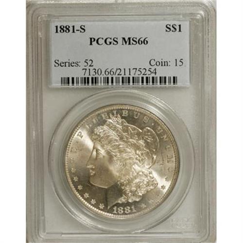 <B>1881-S $1 MS66 PCGS.</B></I> PCGS Population (10197/1333). NGC Census: (11690/2741). Mintage: 12,760,000. Numismedia Wsl. Price for NGC/PCGS coin in MS66: $248. (#7130)<BR><BR><B>Coin Engraver:</B> George T. Morgan<BR><BR><b>Shipping:</b> Coins & Currency (<a target="_blank" href="http://www.heritageauctions.com/common/shipping.php">view shipping information</a>)