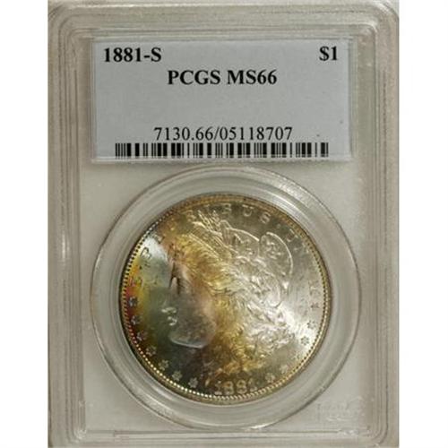 <B>1881-S $1 MS66 PCGS.</B></I> PCGS Population (10197/1333). NGC Census: (11690/2741). Mintage: 12,760,000. Numismedia Wsl. Price for NGC/PCGS coin in MS66: $248. (#7130)<BR><BR><B>Coin Engraver:</B> George T. Morgan<BR><BR><b>Shipping:</b> Coins & Currency (<a target="_blank" href="http://www.heritageauctions.com/common/shipping.php">view shipping information</a>)