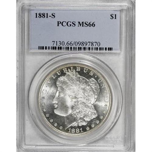 <B>1881-S $1 MS66 PCGS.</B></I> PCGS Population (10169/1347). NGC Census: (11721/2748). Mintage: 12,760,000. Numismedia Wsl. Price for NGC/PCGS coin in MS66: $240. (#7130)<BR><BR><B>Coin Engraver:</B> George T. Morgan<BR><BR><b>Shipping:</b> Coins & Currency (<a target="_blank" href="http://www.heritageauctions.com/common/shipping.php">view shipping information</a>)