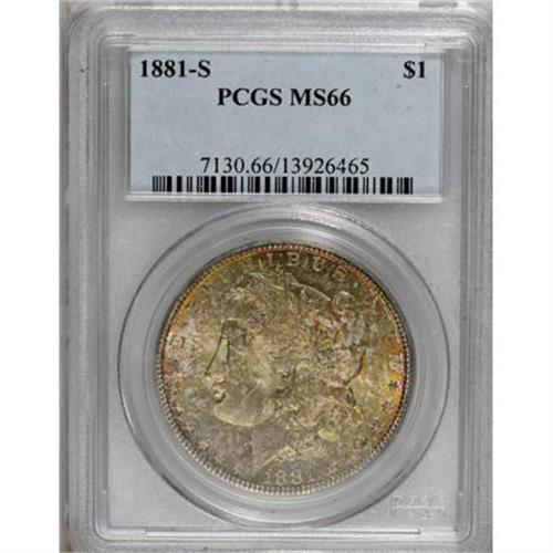<B>1881-S $1 MS66 PCGS.</B></I> PCGS Population (10219/1363). NGC Census: (11721/2748). Mintage: 12,760,000. Numismedia Wsl. Price for NGC/PCGS coin in MS66: $240. (#7130)<BR><BR><B>Coin Engraver:</B> George T. Morgan<BR><BR><b>Shipping:</b> Coins & Currency (<a target="_blank" href="http://www.heritageauctions.com/common/shipping.php">view shipping information</a>)