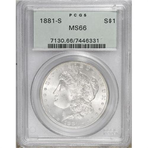 <B>1881-S $1 MS66 PCGS.</B></I> PCGS Population (10236/1364). NGC Census: (11872/2787). Mintage: 12,760,000. Numismedia Wsl. Price for NGC/PCGS coin in MS66: $240. (#7130)<BR><BR><B>Coin Engraver:</B> George T. Morgan<BR><BR><b>Shipping:</b> Coins & Currency (<a target="_blank" href="http://www.heritageauctions.com/common/shipping.php">view shipping information</a>)