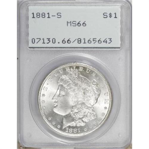 <B>1881-S $1 MS66 PCGS.</B></I> PCGS Population (10266/1374). NGC Census: (11923/2829). Mintage: 12,760,000. Numismedia Wsl. Price for NGC/PCGS coin in MS66: $240. (#7130)<BR><BR><B>Coin Engraver:</B> George T. Morgan<BR><BR><b>Shipping:</b> Coins & Currency (<a target="_blank" href="http://www.heritageauctions.com/common/shipping.php">view shipping information</a>)