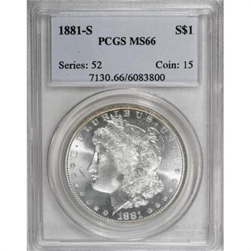 <B>1881-S $1 MS66 PCGS.</B></I> PCGS Population (10253/1369). NGC Census: (11881/2787). Mintage: 12,760,000. Numismedia Wsl. Price for NGC/PCGS coin in MS66: $240. (#7130)<BR><BR><B>Coin Engraver:</B> George T. Morgan<BR><BR><b>Shipping:</b> Coins & Currency (<a target="_blank" href="http://www.heritageauctions.com/common/shipping.php">view shipping information</a>)