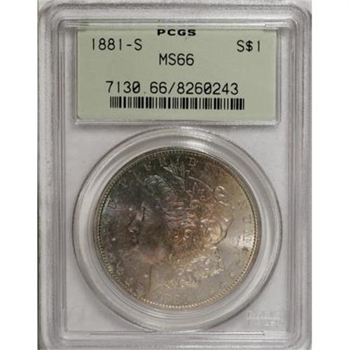<B>1881-S $1 MS66 PCGS.</B></I> . PCGS Population (10297/1380). NGC Census: (11970/2850). Mintage: 12,760,000. Numismedia Wsl. Price for NGC/PCGS coin in MS66: $240. (#7130)<BR><BR><B>Coin Engraver:</B> George T. Morgan<BR><BR><b>Shipping:</b> Coins & Currency (<a target="_blank" href="http://www.heritageauctions.com/common/shipping.php">view shipping information</a>)