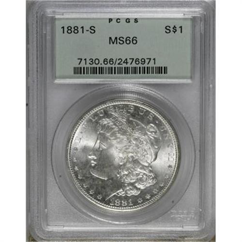 <B>1881-S $1 MS66 PCGS.</B></I> PCGS Population (10334/1390). NGC Census: (12020/2868). Mintage: 12,760,000. Numismedia Wsl. Price for NGC/PCGS coin in MS66: $240. (#7130)<BR><BR><B>Coin Engraver:</B> George T. Morgan<BR><BR><b>Shipping:</b> Coins & Currency (<a target="_blank" href="http://www.heritageauctions.com/common/shipping.php">view shipping information</a>)