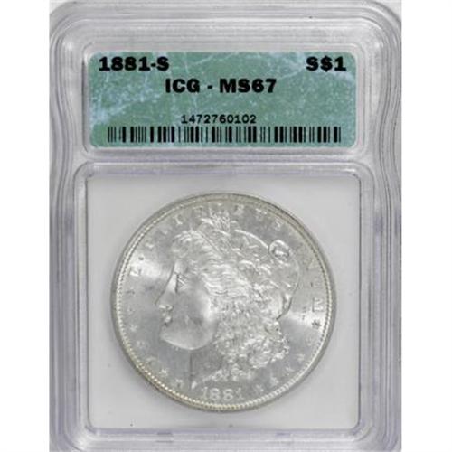 <B>1881-S $1 MS67 ICG.</B></I> A brilliant obverse gives way to a vividly toned, multicolored reverse, and an attentive strike sharpens all of the design features. Pleasing luster issues from well preserved surfaces.<BR><BR><B>Coin Engraver:</B> George T. Morgan<BR><BR><b>Shipping:</b> Coins & Currency (<a target="_blank" href="http://www.heritageauctions.com/common/shipping.php">view shipping information</a>)