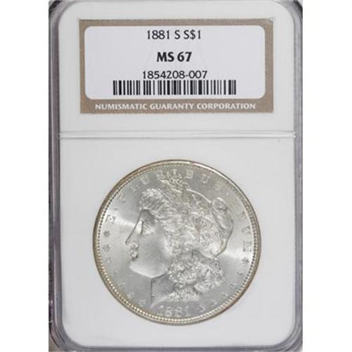 <B>1881-S $1 MS67 NGC.</B></I> This crisply struck and practically untoned type piece has powerful luster and a delightful overall appearance. Only a hint of haze appears in the fields surrounding the portrait.<BR><BR><b>Shipping:</b> Coins & Currency (<a target="_blank" href="http://www.heritageauctions.com/common/shipping.php">view shipping information</a>)