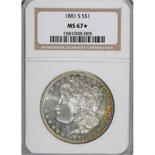 <B>1881-S $1 MS67 <img border='0' src='http://www.heritagecoins.com/images/star.gif' width=10 height=10> NGC.</B></I> This flashy Superb Gem is mostly brilliant, but has beautiful arcs of powder-blue, lemon, and fire-red along the lower right obverse border. Sharply struck, as usual for an '81-S, and the cheek is immaculate.<BR><BR><B>Coin Engraver:</B> George T. Morgan<BR><BR><b>Shipping:</b> Coins & Currency (<a target="_blank" href="http://www.heritageauctions.com/common/shipping.php">view shipping information</a>)