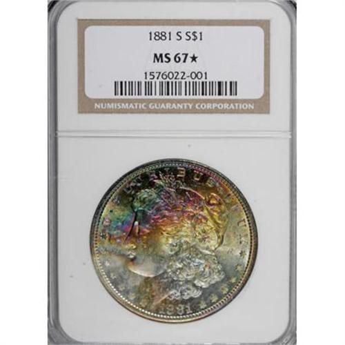 <B>1881-S $1 MS67 </B></I> S<B> NGC.</B></I> The 1881-S, with a mintage approaching 13 million coins, is one of the commonest Mint State Morgan dollars. Examples possessing the coveted Star designation, however, especially in the lofty grade of MS67, are quite scarce. The radiantly lustrous surfaces of the Superb Gem with Star coin in this lot display splashes of vivid crimson, forest-green, and gold toning on the obverse, while remaining nearly untoned on the reverse. An impressive strike emboldens the design elements, and close scrutiny reveals no mentionable marks.<BR><BR><B>Coin Engraver:</B> George T. Morgan<BR><BR><b>Shipping:</b> Coins & Currency (<a target="_blank" href="http://www.heritageauctions.com/common/shipping.php">view shipping information</a>)