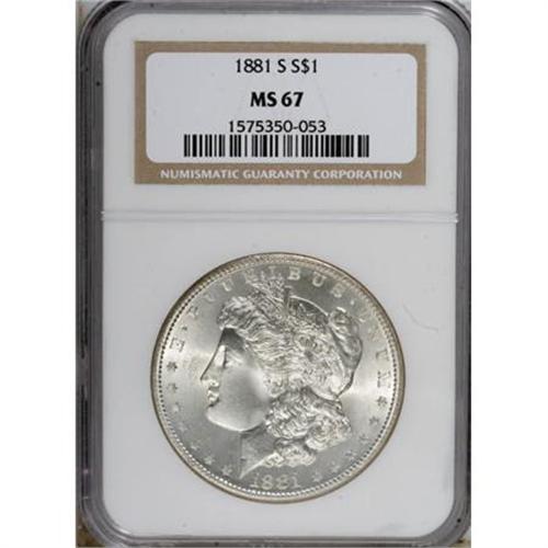 <B>1881-S $1 MS67 NGC.</B></I> NGC Census: (2607/134). PCGS Population (1248/82). Mintage: 12,760,000. Numismedia Wsl. Price for NGC/PCGS coin in MS67: $765. (#7130)<BR><BR><B>Coin Engraver:</B> George T. Morgan<BR><BR><b>Shipping:</b> Coins & Currency (<a target="_blank" href="http://www.heritageauctions.com/common/shipping.php">view shipping information</a>)