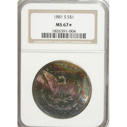 <B>1881-S $1 MS67 </B></I> S<B> NGC.</B></I> Encapsulated reverse-up to better showcase that side's spectacular patina. The lower and left regions are violet, with a progression through rose, blue-green, sapphire, and another trip through the rainbow. Decisively struck with vibrant luster, a spectacular choice for the type collector.<BR><BR><B>Coin Engraver:</B> George T. Morgan<BR><BR><b>Shipping:</b> Coins & Currency (<a target="_blank" href="http://www.heritageauctions.com/common/shipping.php">view shipping information</a>)
