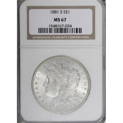 <B>1881-S $1 MS67 NGC.</B></I> Almond-gold enriches the upper reverse, and visits the remainder of this lustrous and exactingly struck Superb Gem. The obverse is nearly pristine, and the reverse is also impressively smooth.<BR><BR><B>Coin Engraver:</B> George T. Morgan<BR><BR><b>Shipping:</b> Coins & Currency (<a target="_blank" href="http://www.heritageauctions.com/common/shipping.php">view shipping information</a>)