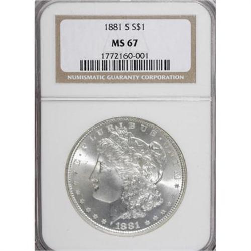 <B>1881-S $1 MS67 NGC.</B></I> Attractive luster adorns both sides of this Superb Gem, and a powerful strike emboldens the design elements. A couple of trivial marks are noted on the obverse.<BR><BR><B>Coin Engraver:</B> George T. Morgan<BR><BR><b>Shipping:</b> Coins & Currency (<a target="_blank" href="http://www.heritageauctions.com/common/shipping.php">view shipping information</a>)