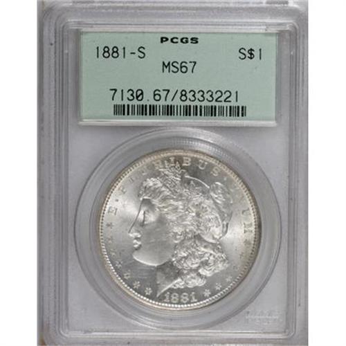 <B>1881-S $1 MS67 PCGS.</B></I> Untoned and lustrous with an exacting strike and outstanding preservation. An excellent entry point into this popular series. Housed in an old green label holder.<BR><BR><B>Coin Engraver:</B> George T. Morgan<BR><BR><b>Shipping:</b> Coins & Currency (<a target="_blank" href="http://www.heritageauctions.com/common/shipping.php">view shipping information</a>)