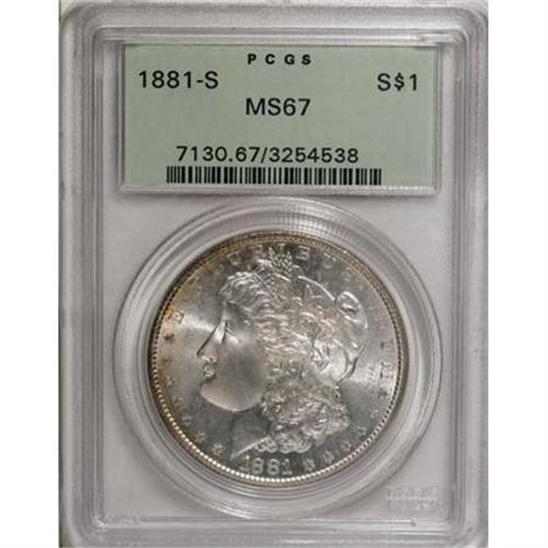 <B>1881-S $1 MS67 PCGS.</B></I> This outstanding silver type coin has a razor-sharp strike and nearly unabraded surfaces. Light gold patina enriches the peripheries. Encased in a green label holder.<BR><I>From The Jimmy G. PCGS Registry Collection of Morgan Dollars with Varieties.</B></I><BR><BR><B>Coin Engraver:</B> George T. Morgan<BR><BR><b>Shipping:</b> Coins & Currency (<a target="_blank" href="http://www.heritageauctions.com/common/shipping.php">view shipping information</a>)