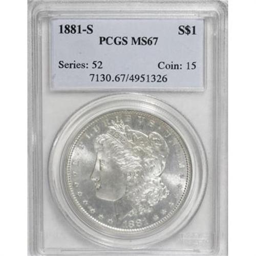 <B>1881-S $1 MS67 PCGS.</B></I> Bright luster issues from each side of this impressively struck Superb Gem. Impeccably preserved surfaces show just a hint of tan color on the eagle's torso. <BR><BR><B>Coin Engraver:</B> George T. Morgan<BR><BR><b>Shipping:</b> Coins & Currency (<a target="_blank" href="http://www.heritageauctions.com/common/shipping.php">view shipping information</a>)