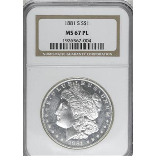 <B>1881-S $1 MS67 Prooflike NGC.</B></I> This sharply struck and flashy Superb Gem offers moderately reflective fields and frosty silver-white devices. A great example of this popular type issue. NGC has graded just seven finer Prooflike pieces (10/07).<BR><BR><B>Coin Engraver:</B> George T. Morgan<BR><BR><b>Shipping:</b> Coins & Currency (<a target="_blank" href="http://www.heritageauctions.com/common/shipping.php">view shipping information</a>)