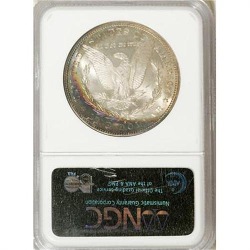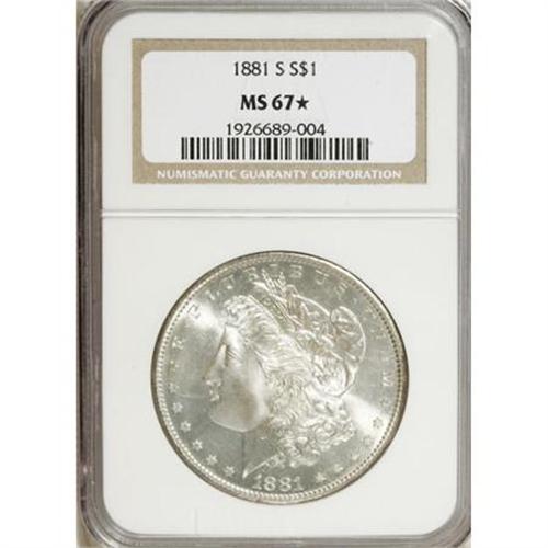 <B>1881-S $1 MS67 <img src="/images/star.gif" width="10" height="10" alt="" border="0"> NGC.</B></I> Beautiful bands of powder-blue, jade-green, and cherry-red grace the left reverse border, while the remainder of this penetratingly struck Superb Gem has only light gold toning. Highly lustrous, and the portrait and obverse field are immaculate.<BR><BR><B>Coin Engraver:</B> George T. Morgan<BR><BR><b>Shipping:</b> Coins & Currency (<a target="_blank" href="http://www.heritageauctions.com/common/shipping.php">view shipping information</a>)