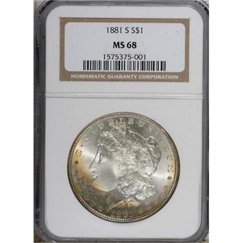 <B>1881-S $1 MS68 NGC.</B></I> David Bowers (2006) calls the 1881-S "the commonest Mint State Morgan dollar of the 1878-1904 era." And common and readily available it is, as NGC and PCGS have certified tens of thousands of examples through MS67. The certified population figures drop off drastically in MS68, however. The highly lustrous surfaces of this MS68 coin are untoned save for an arc of multicolored patina along the lower left obverse border. A powerful strike results in crisp definition on all of the design elements, and both faces are immaculately preserved.<BR><BR><B>Coin Engraver:</B> George T. Morgan<BR><BR><b>Shipping:</b> Coins & Currency (<a target="_blank" href="http://www.heritageauctions.com/common/shipping.php">view shipping information</a>\)