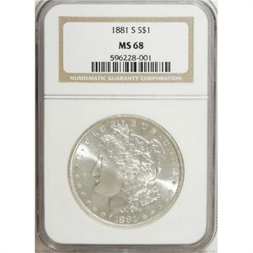 <B>1881-S $1 MS68 NGC.</B></I> The quality of production and relative ease in locating a high grade survivor has always made the 1881-S Morgan a favorite among beginning collectors of this popular series and for those seeking a single type representative. Once in a great while a coin has somehow managed to escape unscathed from the rigors of residing a canvas bag with 999 of its close cousins. Here is one such example.<BR><BR><B>Coin Engraver:</B> George T. Morgan<BR><BR><b>Shipping:</b> Coins & Currency (<a target="_blank" href="http://www.heritageauctions.com/common/shipping.php">view shipping information</a>\)