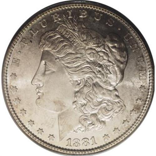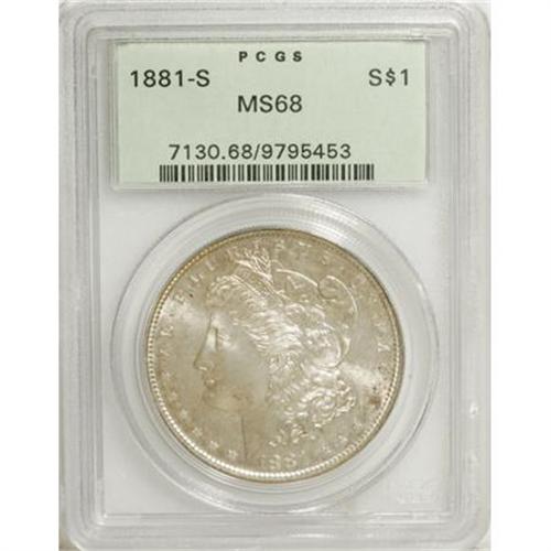 <B>1881-S $1 MS68 PCGS.</B></I> The surfaces are nearly untoned, save for a whisper of smoke-gray and russet patina. Only a single small tick appears on Liberty's otherwise-pristine cheek, and the strike is predictably full. Certified in a green-label holder. Population: 80 in 68, 2 finer (7/07).<BR><BR><B>Coin Engraver:</B> George T. Morgan<BR><BR><b>Shipping:</b> Coins & Currency (<a target="_blank" href="http://www.heritageauctions.com/common/shipping.php">view shipping information</a>\)